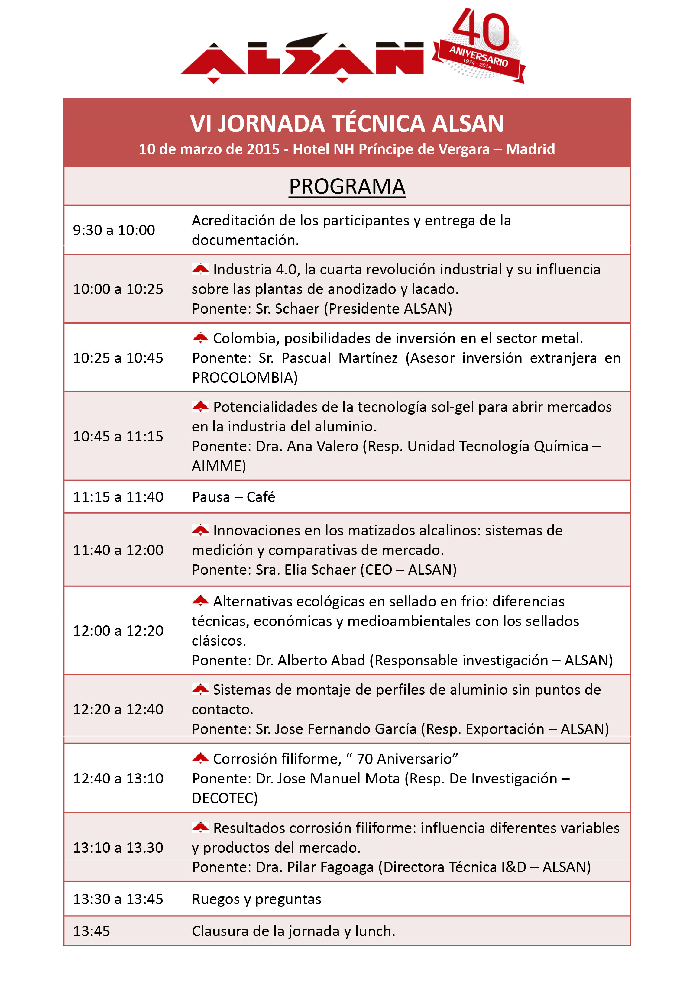 El próximo 10 de marzo, en los salones del hotel NH Príncipe de Vergara de Madrid, ALSAN celebrará las VI Jornadas Técnicas con motivo de su 40 aniversario. Industria 4.0, Tecnología Sol Gel, Inversión en Colombia, o Alternativas ecológicas al sellado en frío, serán algunos de los temas que trataremos.