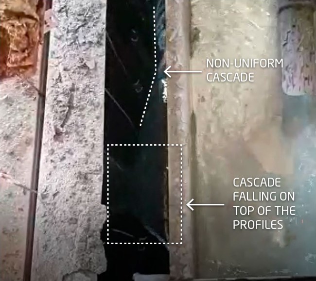 STAGE 3 – DI WATER RINSE: Cascade stage. The cascade is uniform and the height where it impacts on the profile is good, a correct external rinsing is achieved.