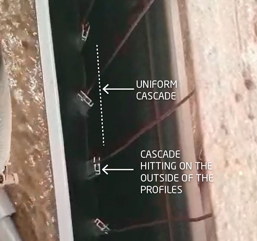 The cascades on the vertical lines are basic to obtain a perfect pre-treatment on the surface of the aluminium. It is not enough to wet the profiles, they must be adapted in height, length and flow.
