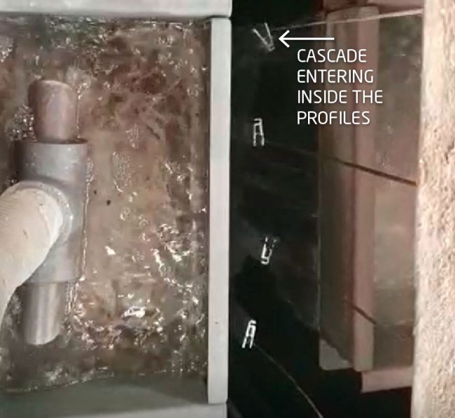 STAGE 1 – ACID ETCHING: Cascade stage. Originally this etching was by spray but it was modified to cascade. The incorrect position of the drawers caused the profiles to get soaked both inside and outside. Instead of hitting the outside of the profiles, the liquid went inside the profiles.