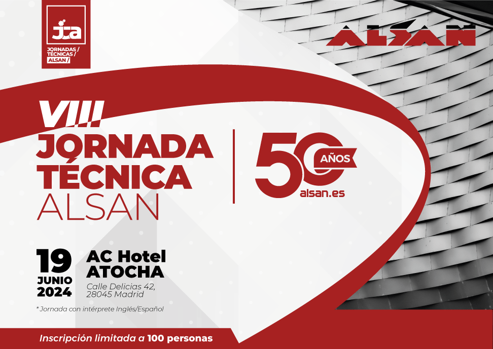 El próximo 19 de junio de 2024 celebraremos en el AC Hotel Atocha de Madrid, nuestra ya VIII Jornada Técnica Alsan. Este evento histórico, especialmente significativo ya que coincide con nuestro 50 aniversario en la industria del aluminio, esperamos que se convierta en una experiencia enriquecedora para los clientes y amigos que nos acompañen.