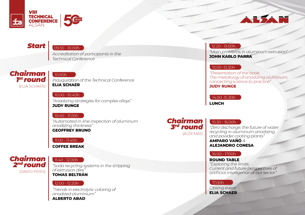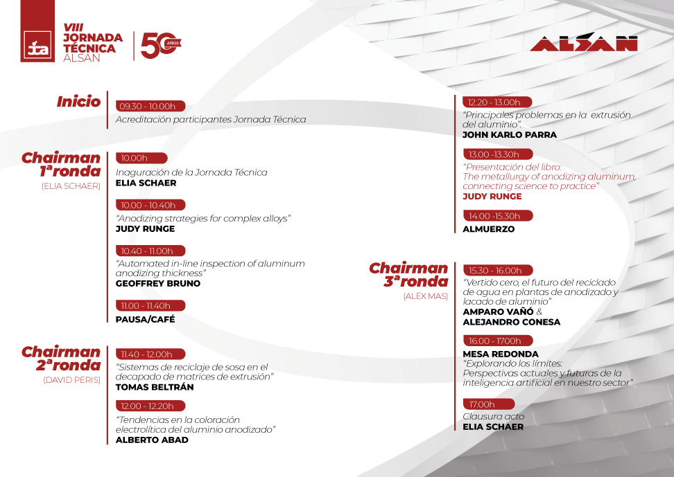 Esta octava Jornada Técnica Alsan no es sólo una oportunidad para adquirir conocimientos sobre las últimas tendencias e innovaciones de la industria; es una celebración de nuestro compromiso permanente con la excelencia en la industria del aluminio. Mientras reflexionamos sobre nuestro legado de 50 años y miramos hacia los avances futuros, queremos reunirnos junto con nuestros clientes y amigos para continuar dando forma a la próxima era de la industria del aluminio. Esperamos contar con su asistencia.