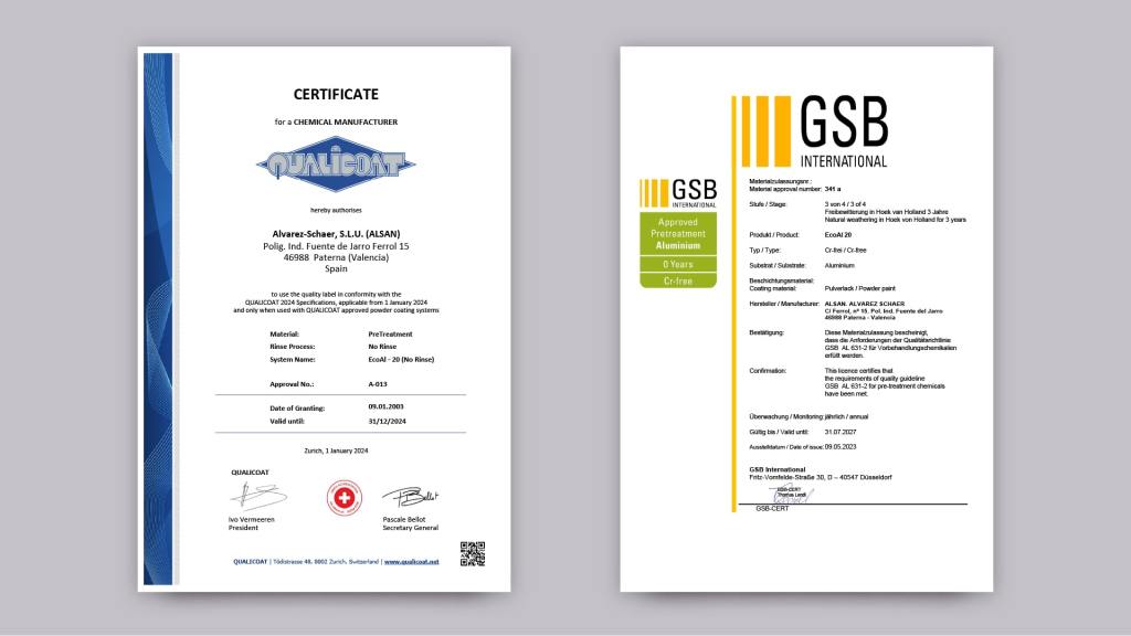 EcoAl® 20 was firstly approved by QUALICOAT in 2003 (A-013). Since then, has successfully been used in more than 100 coating lines in 25 different countries. EcoAl® 20 is currently working in 62 coating lines with QUALICOAT certificate around the world and stands out as the second most used solution among the 85 Chrome-free products approved by QUALICOAT. We estimate that, under QUALICOAT certification, more than 120.000.000 square meter of extruded aluminium are treated with EcoAl® 20 every year around the world. EcoAl® 20 has recently been further recognized by obtaining the prestigious license from GSB International, certifying its compliance with the stringent quality standards of GSB AL 631-2 for chemicals used in aluminum pretreatment.