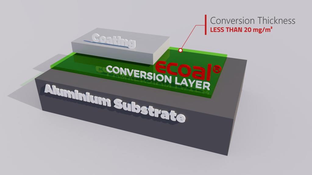 EcoAl® 20 can be applied by immersion, cascade or spray. The conversion layer obtained with the EcoAl® 20 allows excellent results on adhesion and corrosion resistance to be obtained with all types of paints and specifically grants great protection against filiform corrosion. With EcoAl® 20, correct conversion layers could be quickly achieved, just with a short time of contact (immersion/spray/cascade), around 10-60 seconds.